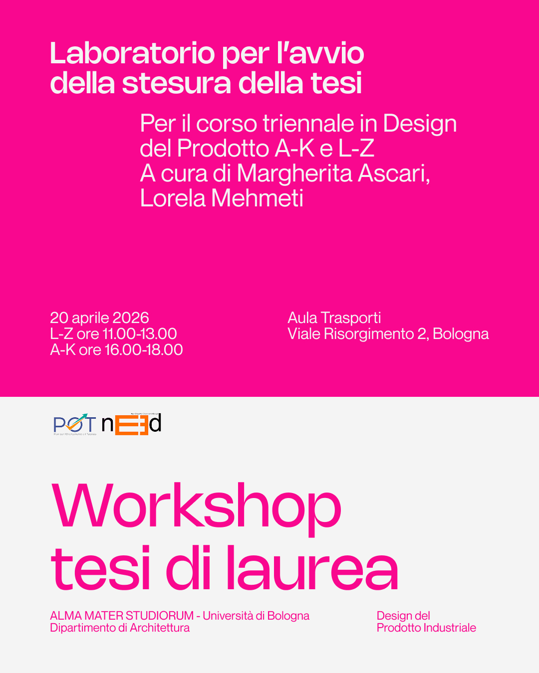 Un workshop pratico per gli studenti di design dell’ultimo anno che affrontano la scrittura della tesi. Dalla definizione della struttura alla gestione delle fonti, dalle strategie di scrittura alla relazione con il supervisor, fino alle procedure di consegna: un percorso per acquisire metodo e sicurezza nel lavoro di ricerca.