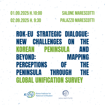 Siamo lieti di annunciare la seconda edizione di ROK-EU Strategic Dialogue: New Challenges on the Korean Peninsula and Beyond: Mapping Perceptions of the Peninsula through the Global Unification Survey. L'evento si svolge in un momento di profonda instabilità internazionale, che rende la Penisola coreana una questione cruciale per la pace e la sicurezza internazionale. Il dialogo presenterà i più recenti risultati del Global Unification Survey, offrendo nuove prospettive sulle percezioni globali delle relazioni inter-coreane e delle possibilità di unificazione. Studiosi ed esperti europei e internazionali contribuiranno a delineare nuove strategie di diplomazia della Corea del Sud.