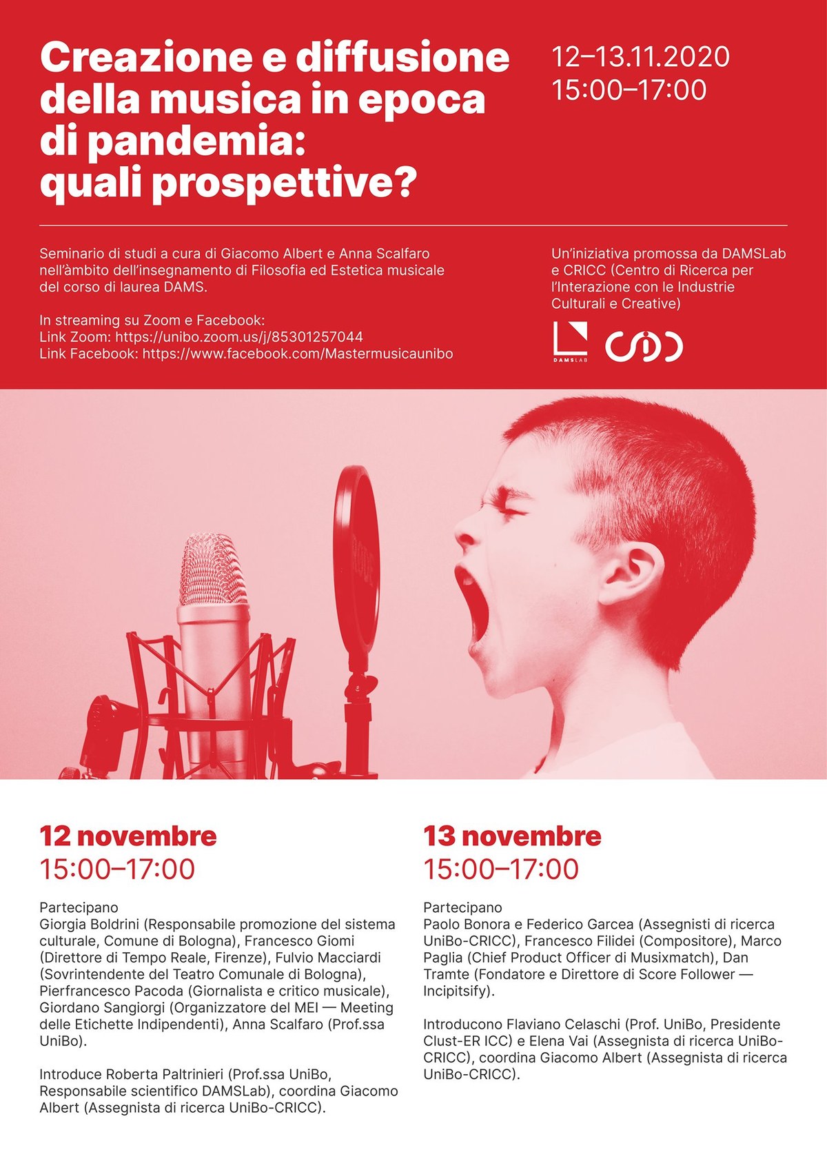 Giovedì 12 Nov, h15-17: “la ricomposizione degli spazi fisici della musica attraverso modalità miste”. Venerdì 13 Nov, h15-17: “gli spazi virtuali della musica”.