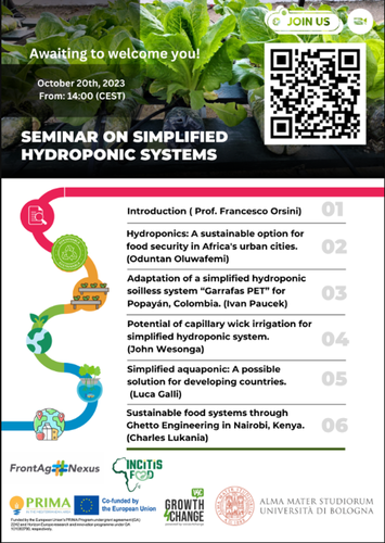 L’idroponia è una tecnologia all’avanguardia che permette di produrre cibo senza suolo, ottimizzando l’uso di acqua e nutrienti. Tuttavia, i costi elevati e l’alto livello tecnologico rischiano di renderla accessibile in modo elitario, escludendo i contesti socio-economici più fragili, come le aree urbane dei Paesi emergenti. L’idroponia semplificata rappresenta una risposta concreta: grazie all’utilizzo di materiali riciclati e a basso costo, può essere implementata anche in ambienti a reddito limitato, contribuendo a migliorare l’accesso al cibo e la sicurezza alimentare. Ne abbiamo parlato il 20 ottobre 2023 al webinar, pubblicamente accessibile, con ricercatori e ricercatrici provenienti da diverse realtà internazionali: dall’Università di Ibadan (Nigeria), all’Istituto Italo-Latino Americano (Colombia), alla Jomo Kenyatta University (Kenya), fino alle iniziative di ghetto engineering promosse a Nairobi da Growth4Change. Gli studenti di Agraria dell’Alma Mater Studiorum – Università di Bologna hanno così potuto conoscere da vicino come l’idroponia semplificata possa davvero diventare uno strumento chiave per rafforzare la sicurezza alimentare nelle città di oggi e di domani
