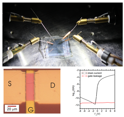Thin film transistors (TFT) are the basic microelectronic component of integrated circuits. For us physicists they are also a versatile test device to characterize transport properties in novel semiconducting materials. The field effect is exploited in TFT to introduce a well quantified amount of free charge cariers. The DC current across the semiconducting channel then provides information about how fast these carriers move and other material specific parameters. Our electronic instrumentation permits the precise measurement of the related electronic signals. The figure to the left features as an example the characterization of an amorphous oxide semiconductor based TFT fabricated at the University of Lissbon in Protugal. Micromanipulator probes are used to connect the TFT electrically to our measurement instrumentation. The DC current measurements then reveal optimal TFT behaviour with a steep transition between on/off range, low off- currents in the range of a few pico-amperes and a high mobility of 19 cm2/Vs.