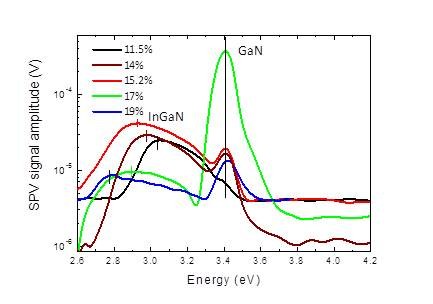 Surface Photovoltage spectra of InGaN/GaN heterostructures with different In%. The spectra shows the GaN band gap, which keeps constant, while the InGaN gap varies as a function of In content.