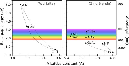 The graph shows band gap energy versus lattice constant for III–V and II–VI semiconductors. Open circles indicate indirect band gap materials. InGaN and AlGaN ternary alloys span a large range of lattice constants. from Leah Y. Kuritzky James S. Speck , MRS Communications, Volume 5, Issue 3, September 2015 , pp. 463-473.