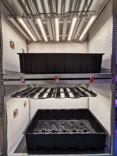Per quanto riguarda l’illuminazione, ogni ripiano è equipaggiato con 8 lampade a luce LED, che emettono un PPFD di 250 µmol m²/s. La struttura utilizza due spettri di luce non dimmerabili, progettati per massimizzare la crescita delle piante in modo efficiente.